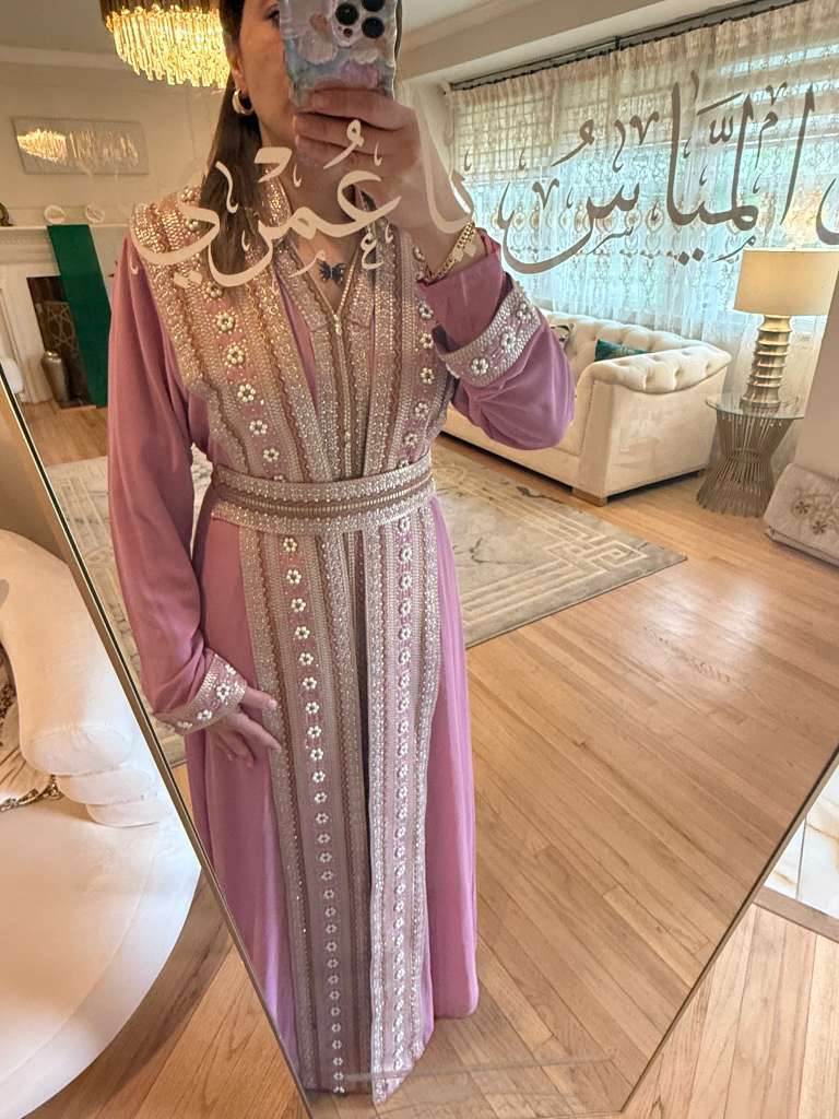 a cream-colored caftan with delicate silver and gold embroidery, featuring vertical embellished panels and a matching embroidered belt for an elegant, refined look.
